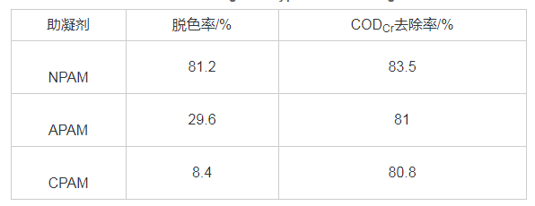 在上述最佳條件下,3組水樣分別投加1mL的陰離子型聚丙烯酰胺(APAM)、陽離子型聚丙烯酰胺(CPAM)、非離子型聚丙烯酰胺(NPAM),(3種助凝劑濃度均為0.5%) , 300r/min快速攪拌1min, 90r/min慢速攪拌10min, 靜止沉降15 min, 結果見表。